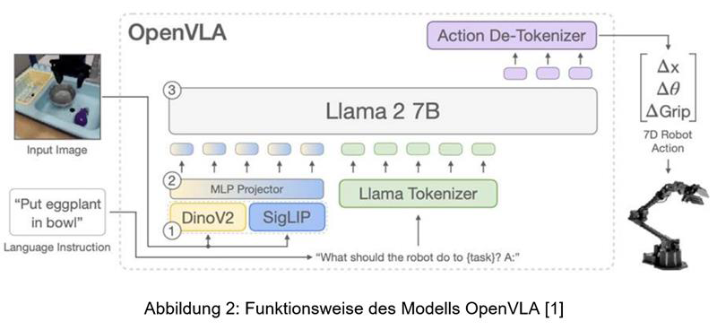 Seit 2022 wurden nach und nach zahlreiche neue VLA-Modelle präsentiert, deren genaue Architektur variiert. Unter anderem werden Large Language Models, Vision Transformer sowie Image- und Text-Tokenizer in unterschiedlichen Konstellationen miteinander kombiniert und als zusammenhängende Einheit trainiert. Die Funktionsweise lässt sich am Beispiel des Open Source VLA-Modells OpenVLA [1] der Stanford University veranschaulichen.
